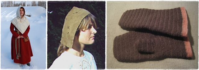 Asusteitakin tarvitaan! Vasemman reunan kuva on myös Agelindesta, huppu on Skjoldehamin löydön mallin mukaan tehty. Keskimmäisessä kuvassa on Jorvikin hilkka ja oikeassa reunassa neulakintaat jotka on varmasti pakko tilata Hiienkissalta joulukuuta varten. (Jospa siellä tapahtumassa sitten joku osaa neuvoa minuakin tekemään tuollaiset tai pääsemään edes alkuun.) Hupun meinasin tehdä villakankaasta ja hilkan värjäämättömästä pellavasta. Aion myös tehdä suorakaiteen muotoisen villaisen viitan että tarkenen mutta siitä ei nyt tähän hätään löytynyt inspiraatiokuvaa.